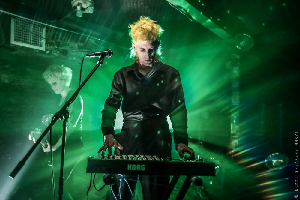 Korine is an electric pop duo from Philadelphia. Their debut LP "New Arrangements" calls to mind early Ministry, "Black Celebration" era Depeche Mode and 90s New Order, all while sounding completely contemporary. Korine uses haunting lyrical imagery and vintage synthesizers to create a world all of their own, one where you can't tell if it's 1984 or 2019.